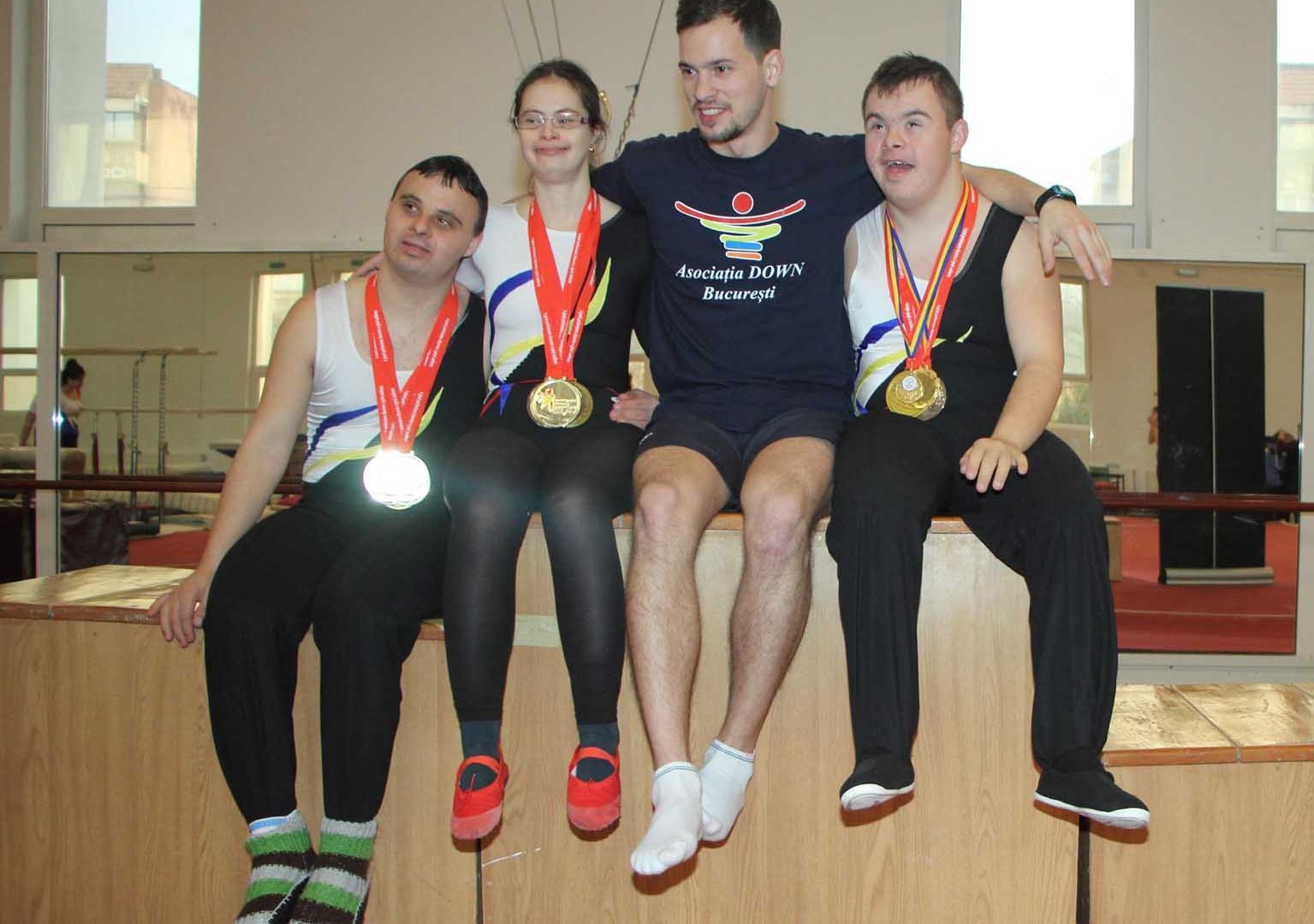 Gimnastica la copii cu sindromul Down trebuie aplicată încă din primele luni de viață. Datorită hipotoniei musculare, aceștia prezintă adevărate probleme la mersul in patru labe și la statul în picioare mai târziu.